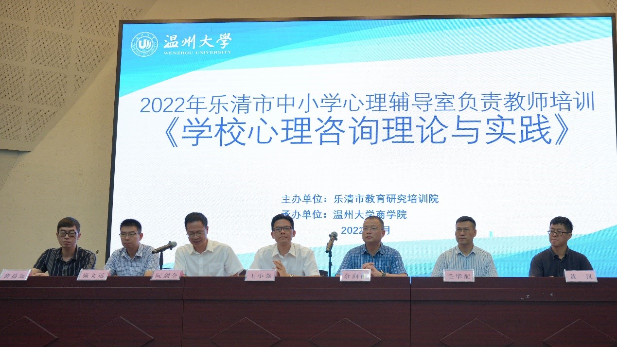 承办的乐清市中小学心理辅导室负责教师培训《学校心理咨询理论和实践》开班仪式在温州大学南校区9号楼报告厅举行。本次活动由乐清市教育局学生科副科长阮剑全主持,乐清市教育发展中心主任王小强、乐清市教育局学生科副科长阮剑全、乐清市教育局学生科干部施文远、乐清市教育研究培训院心理研训员黄益远、银河赌场-澳门银河赌场官网