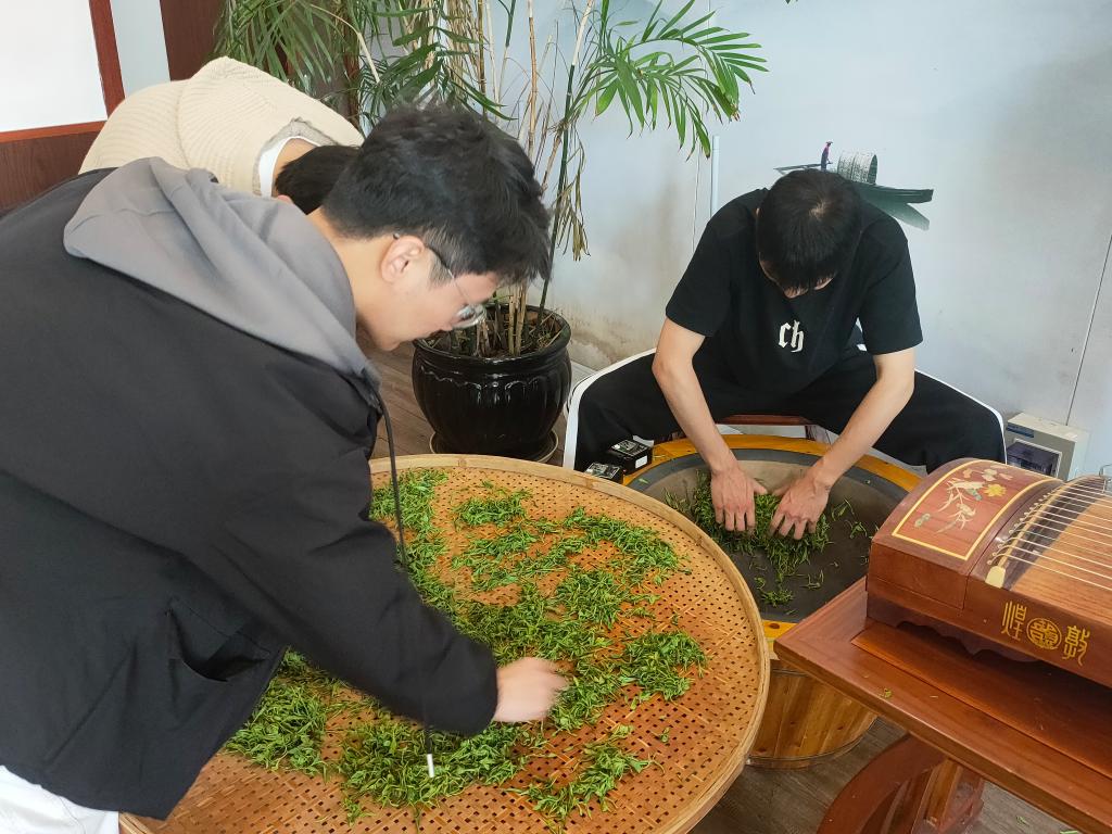 阚文文老师手把手指导识茶、采茶后,三支部的党员同志们化身采茶工,领着茶篓开始沉浸式采茶体验,专心且忙碌地穿梭在茶树之间。随后,阚文文老师还用刚采摘的新鲜茶叶向大家展示炒茶、揉茶技术,支部内党员同志们踊跃加入到炒茶的实践当中,亲身感受炒茶的劳动乐趣。党员们齐参与、共劳动,深入到农耕劳作,在“茶课堂”中体会到“纸上得来终觉浅,绝知此事要躬行”的实践真谛。