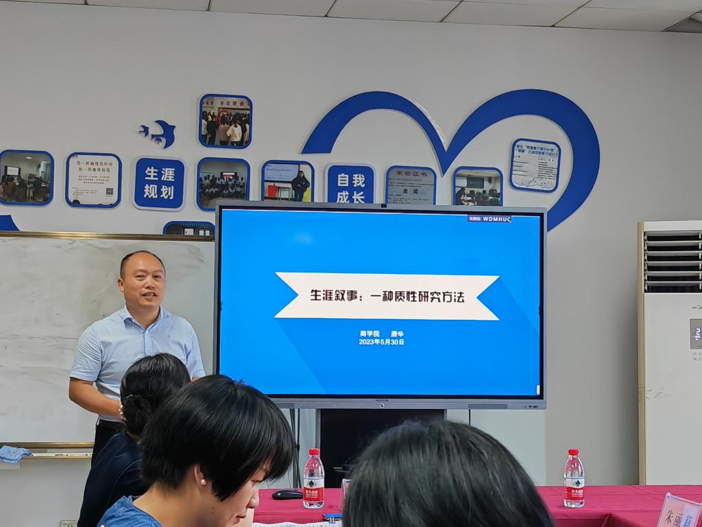 党委副书记唐华以《生涯叙事:一种质性研究方法》为主题,介绍了质性研究、生涯叙事的定义和特征,并进行结合自己的学习经历和实际工作,深入浅出地分享了如何在学生工作和生涯教育中开展质性研究,并鼓励辅导员等学生工作者积极利用质性研究对工作中遇到的案例等进行分析总结,将实际工作积累转化为深层的学术研究。