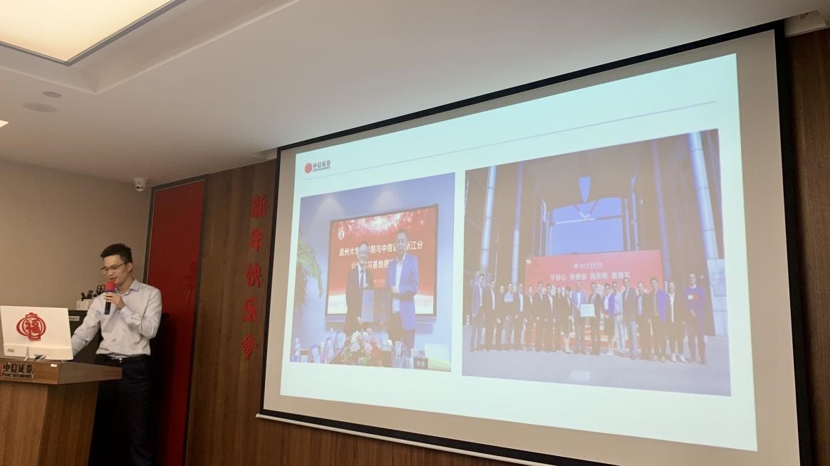 在参观完中信证券证券部与期货部之后,回到大会议室开始见习讲座,并由中信证券温州分公司副总经理章步新亲自主持,首先,温州分公司总经理潘晔女士热烈欢迎温州大学学生前来见习,她提到了一般都是大三的学生前来实习,温大安排大一学生前来见习,对大家的提前了解,做好职业规划具有重要的作用,章步新副总也特别回顾了2019年与温州大学签订大学生实习基地的签约仪式。