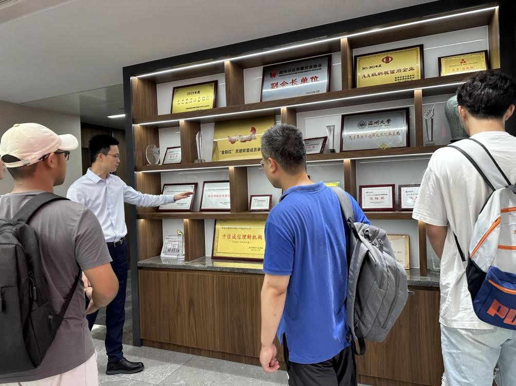 到达中信证券温州分公司后,中信证券工作人员为每个小组安排了具体参观路线。学生们跟随各自的带队老师,深入参观了中信证券各楼层的办公和营业场地以及荣誉墙。他们不仅深入了解了证券公司业务办理大厅、开放式办公区、员工工作模式等方面的情况,同时,员工们也非常乐意回答学生们的问题,分享自己的经验和心得,让学生们深入了解金融行业的内部运行机制。