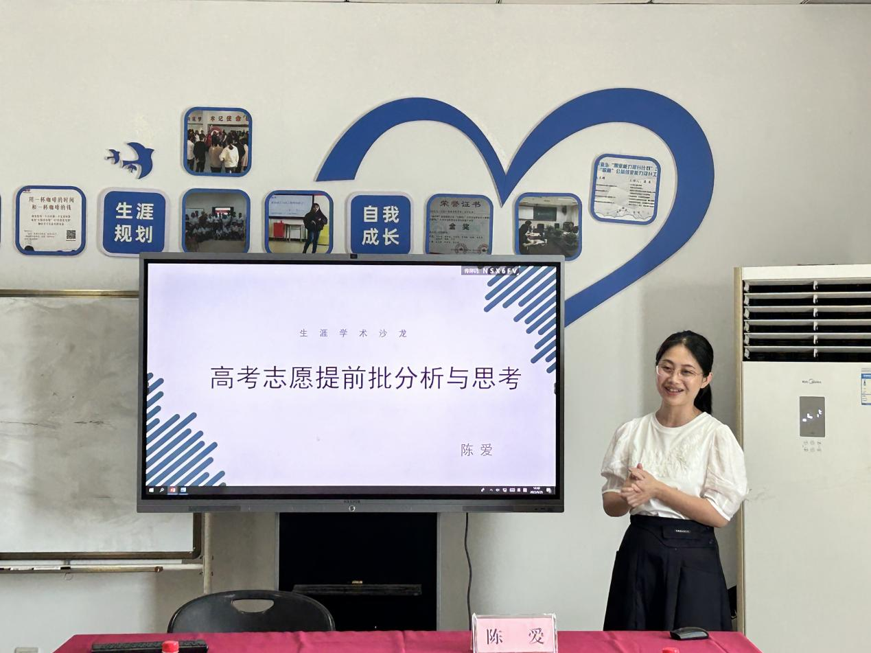 专任教师陈爱老师分享主题为《高考志愿提前批分析与思考》的专题报告。陈爱老师分别从“为什么—高考志愿提前批招录目的、是什么—高考志愿提前批填报优势、怎么做—高考志愿提前批报考准备”三个方面作了深入浅出的介绍。她指出,提前批招录主要是为了服务国家优先战略、推动多元评价方式、促进教育机会公平,报考学生应根据自身优劣势选择提前批的类型,以选择喜欢的职业生涯,进而实现有效就业。