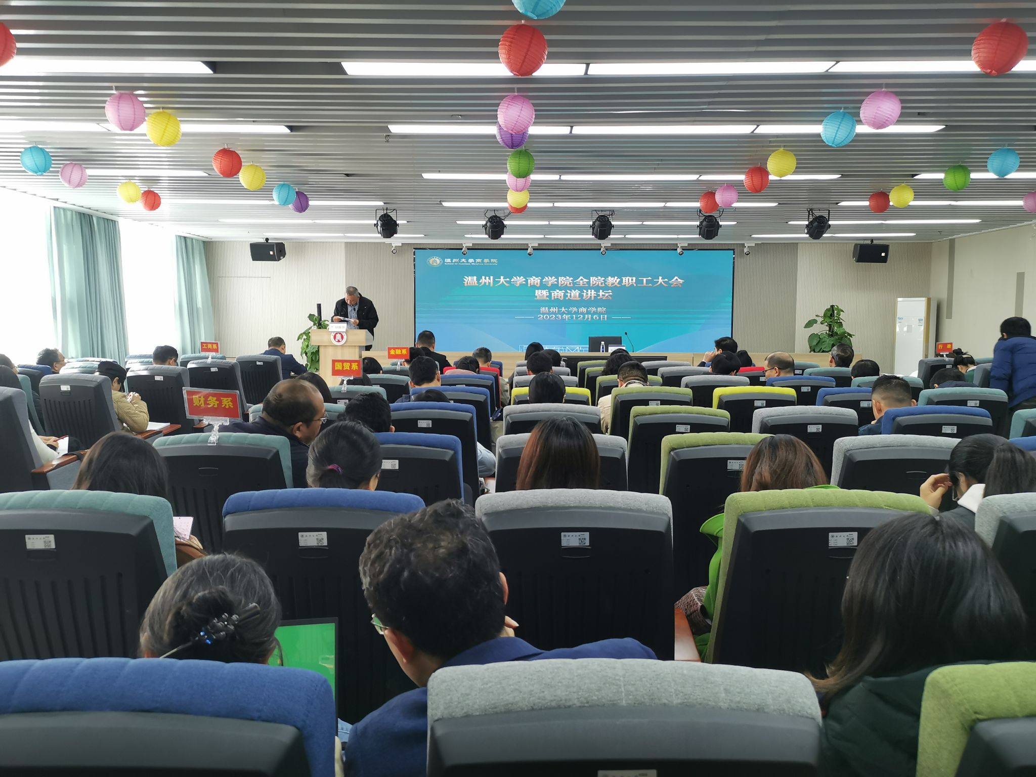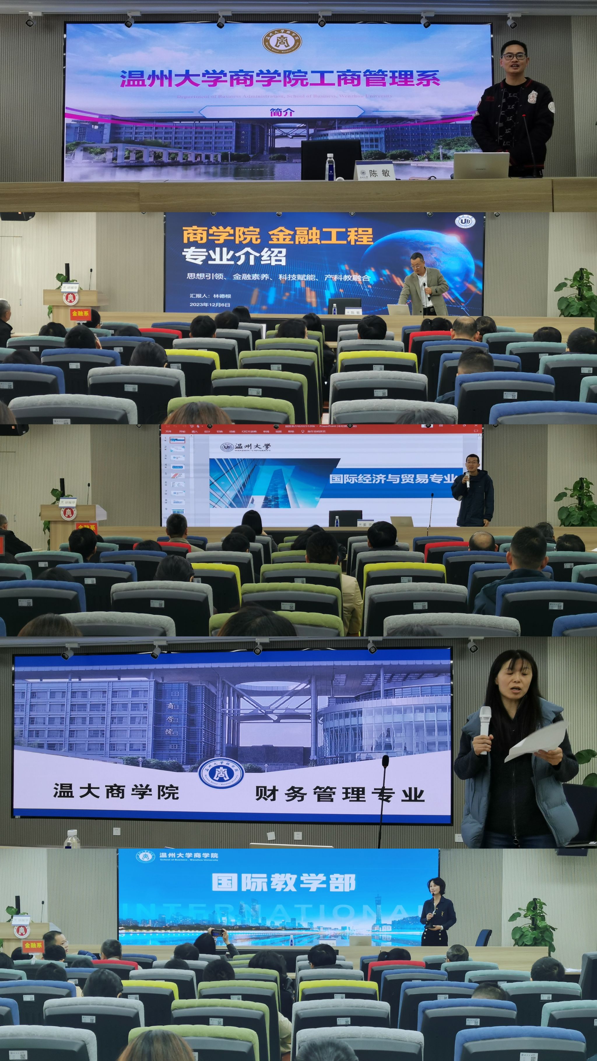 工商系主任陈敏、金融系主任林德根、国贸系主任姜亮、财务系主任王钰、国教部主任章云燕依次上台发言展示,从队伍建设、学科建设、科学研究、专业建设、人才培养、社会服务等方面汇报了各系建设情况与办学成果。