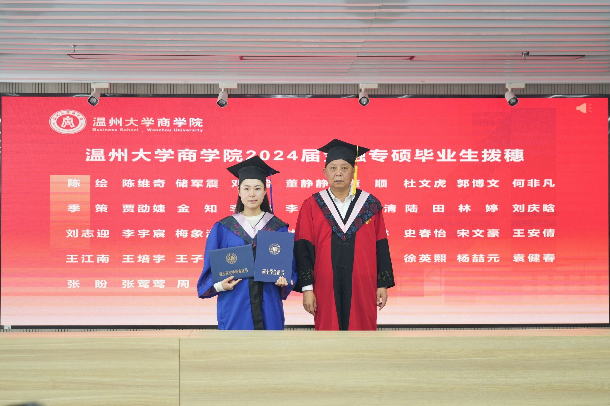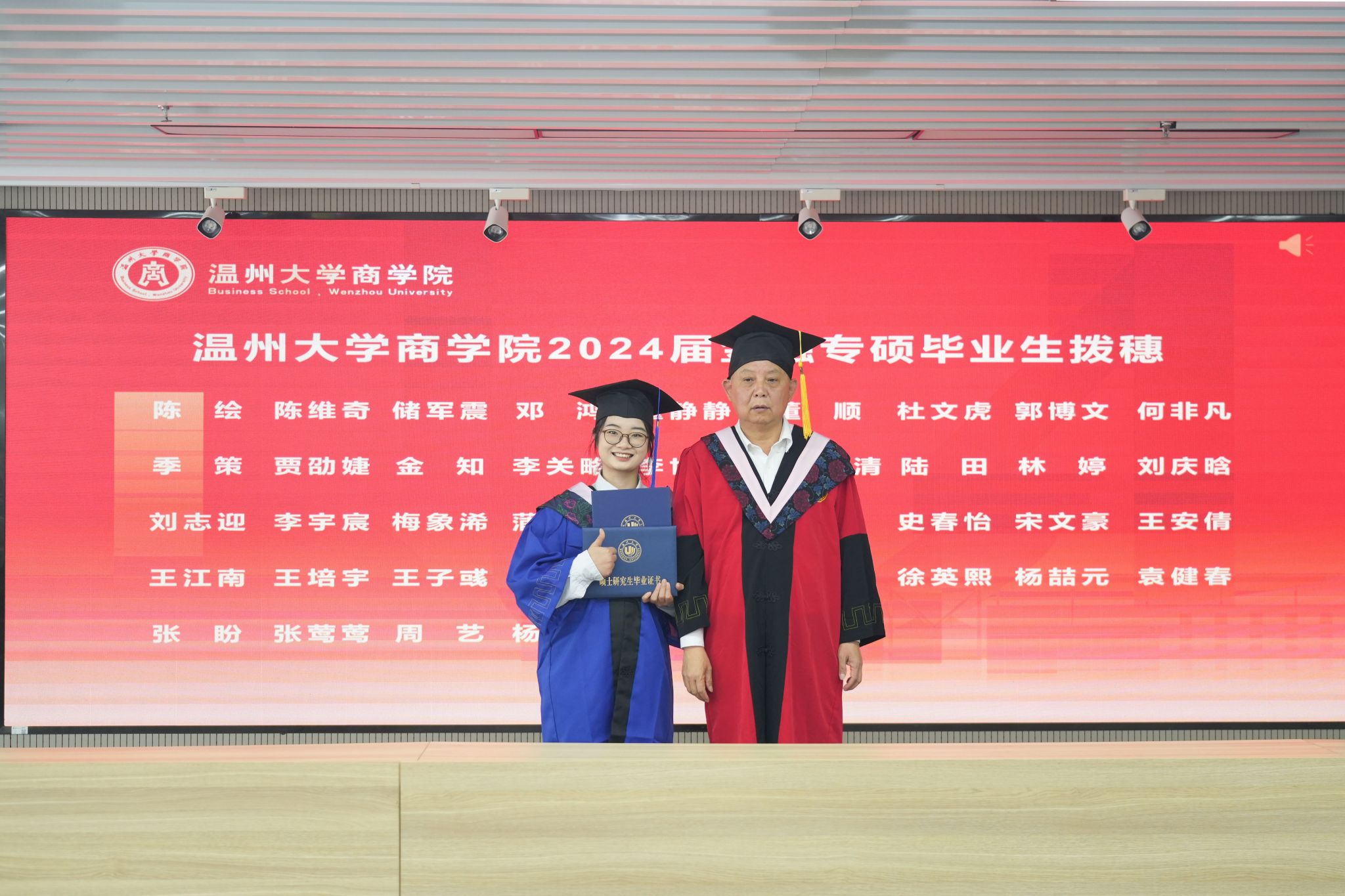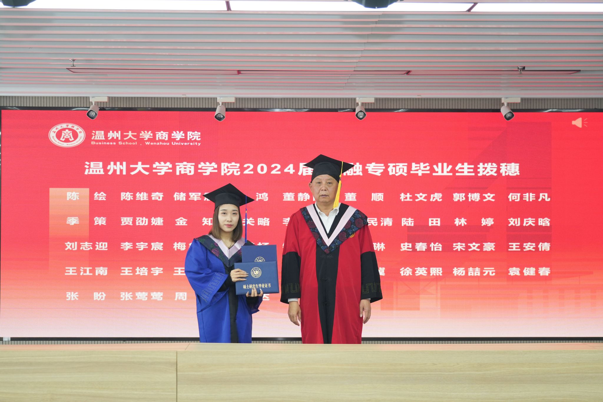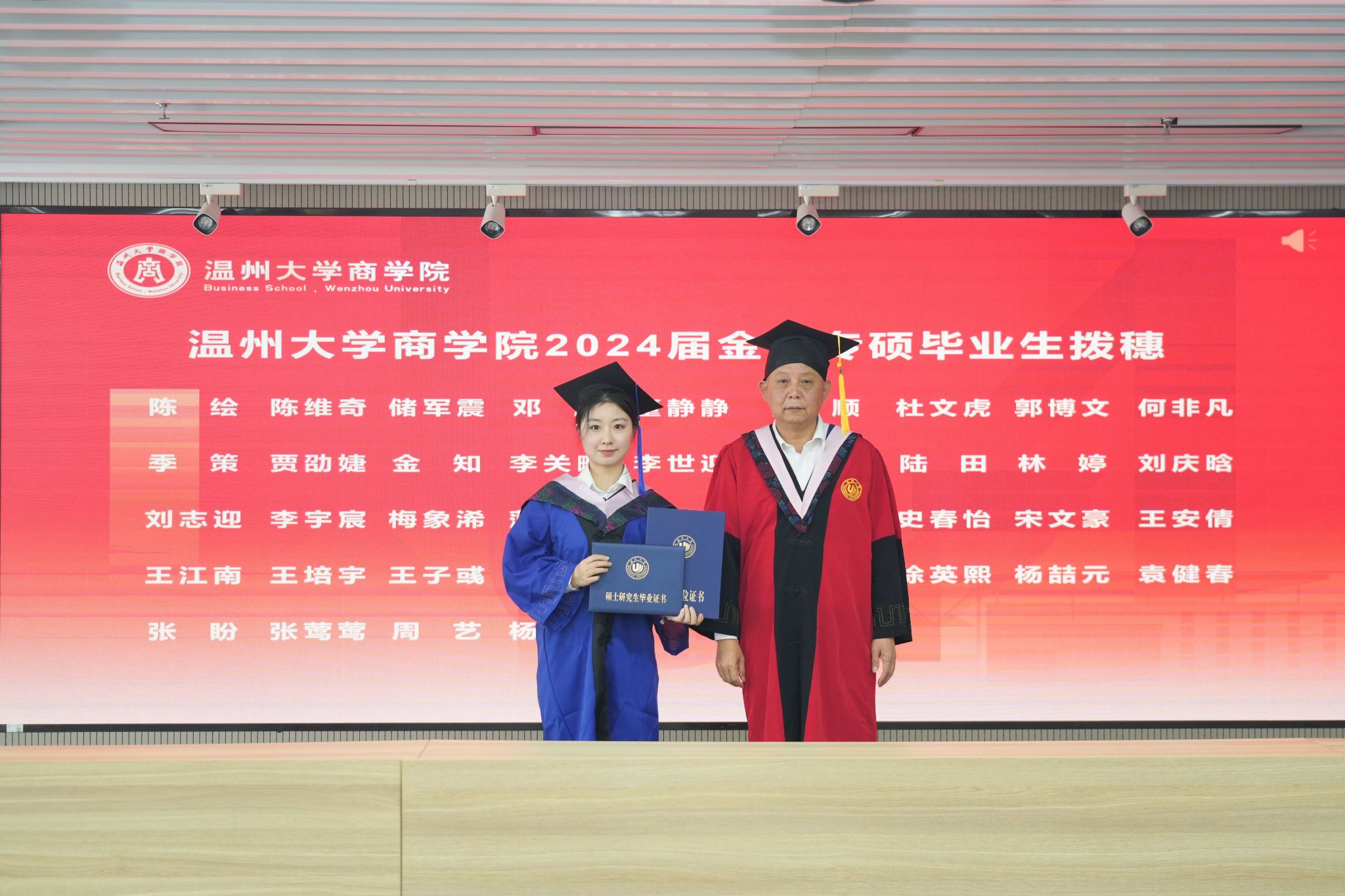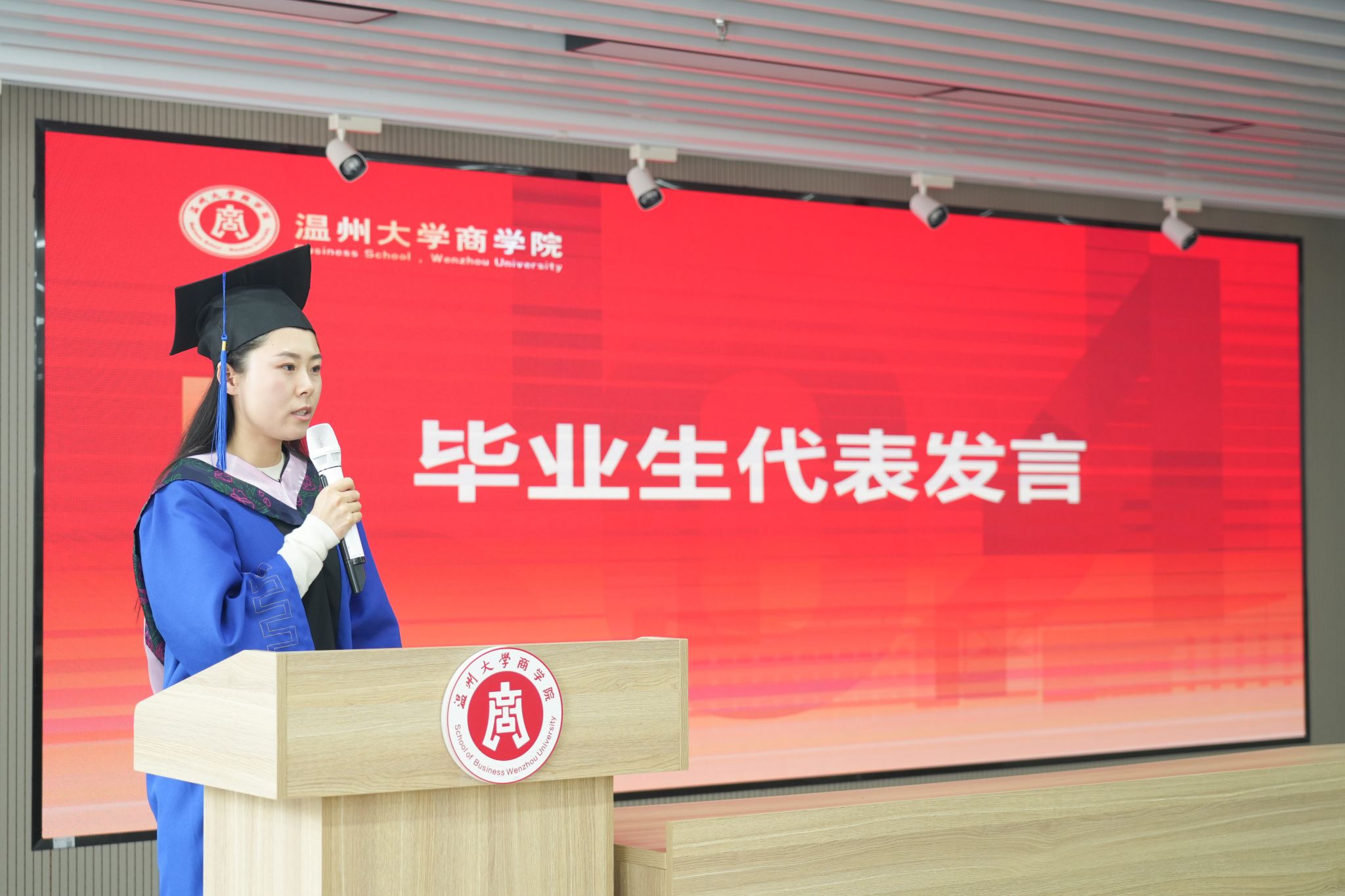 21级金融专硕刘志迎同学作为毕业生代表发言。她感谢温州大学提供的优越求知平台和学习环境,免费开放大量的讲座和优秀的公开课,还有大师级别的老师传道授业解惑。老师们深入浅出的讲解,让学生们更加深刻的理解学术的精髓,同时银河赌场