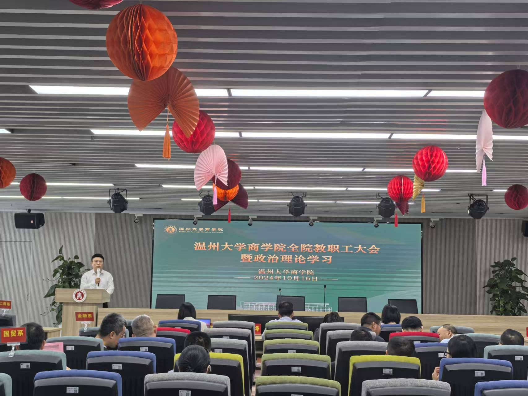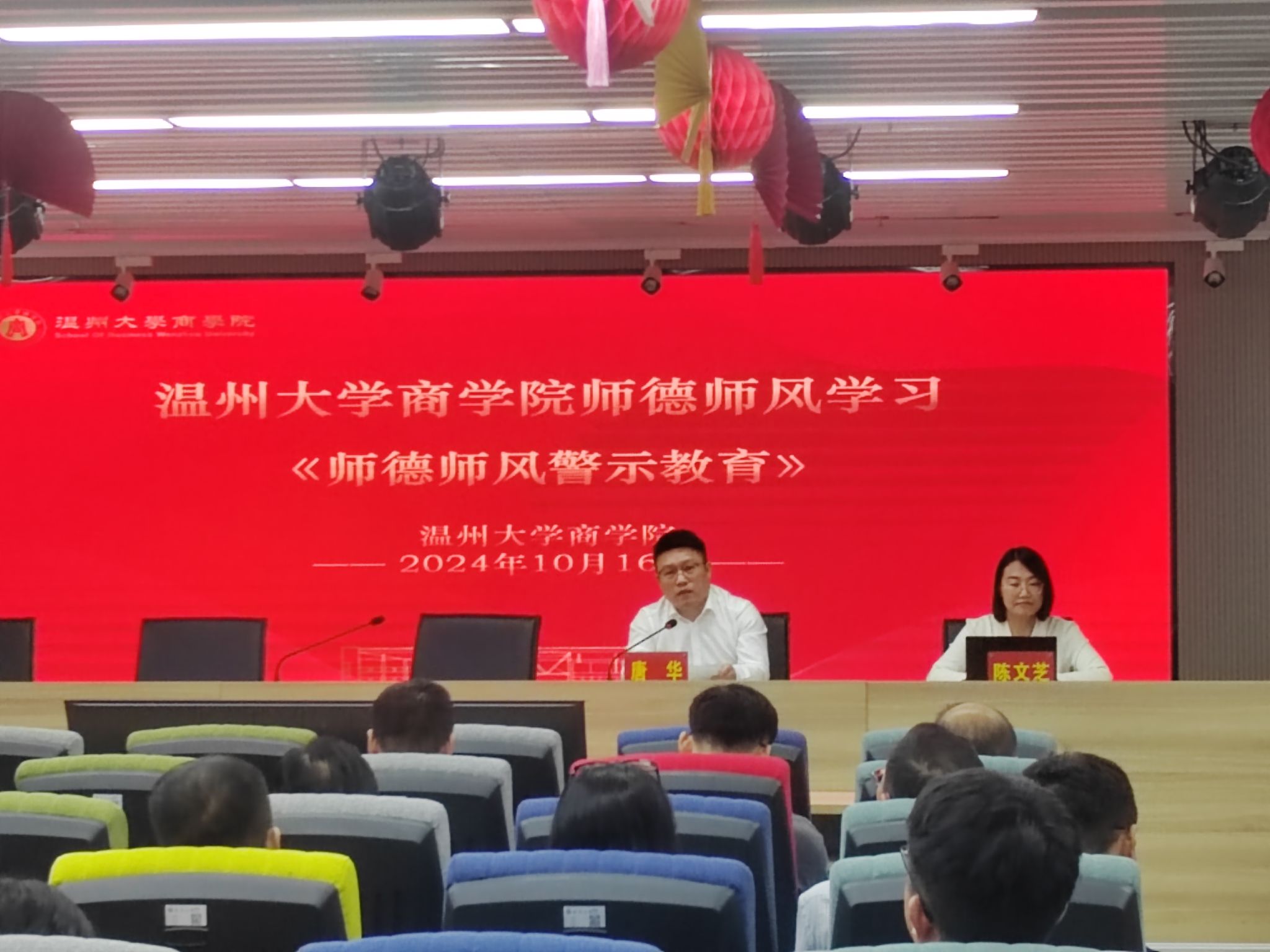最后,唐华书记作全院师德师风教育。他指出,各支部要按照学校教师工作部《关于组织开展秋季师德专题教育活动的通知》要求,2024 年10月底之前,开展好“五个一”秋季师德专题教育活动。唐华书记领学了《新时代高校教师职业行为十项准则》《温州大学教师职业行为规范及师德失范行为处理办法》《温州大学关于进一步加强师德建设的配套制度》等8个文件。并通报了教育部公开曝光的高校教师违反职业行为十项准则的4个典型案例作为警示教育。