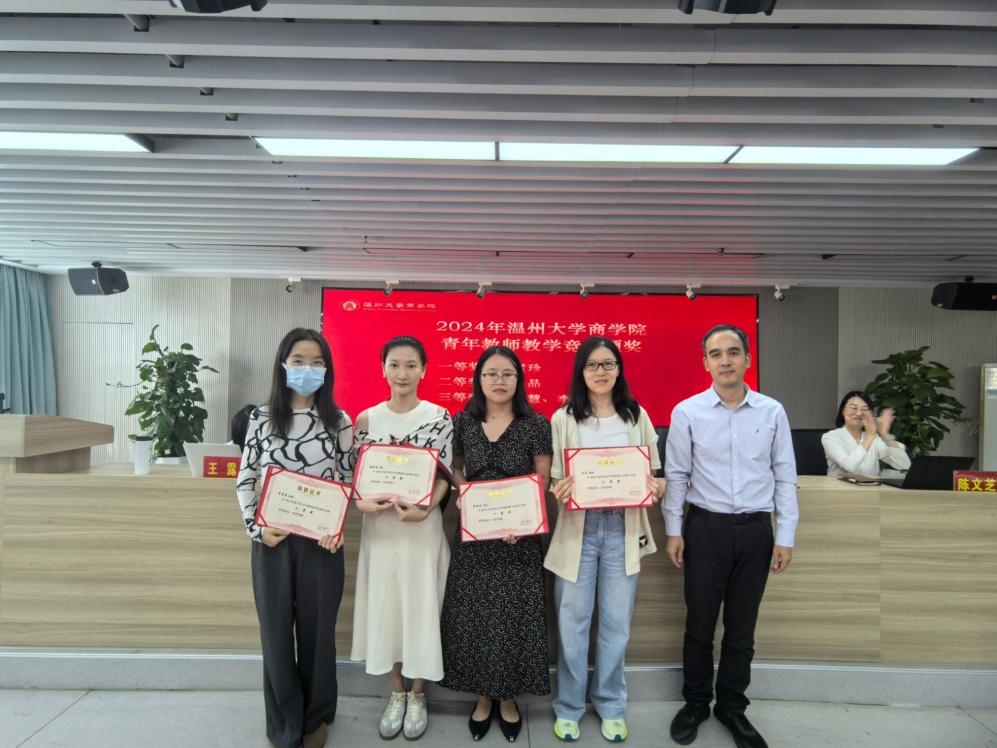 青年教师教学竞赛获奖名单,罗建利院长为一等奖章素珍老师、二等奖潘晶晶老师、三等奖李慧慧和李园老师进行颁奖。