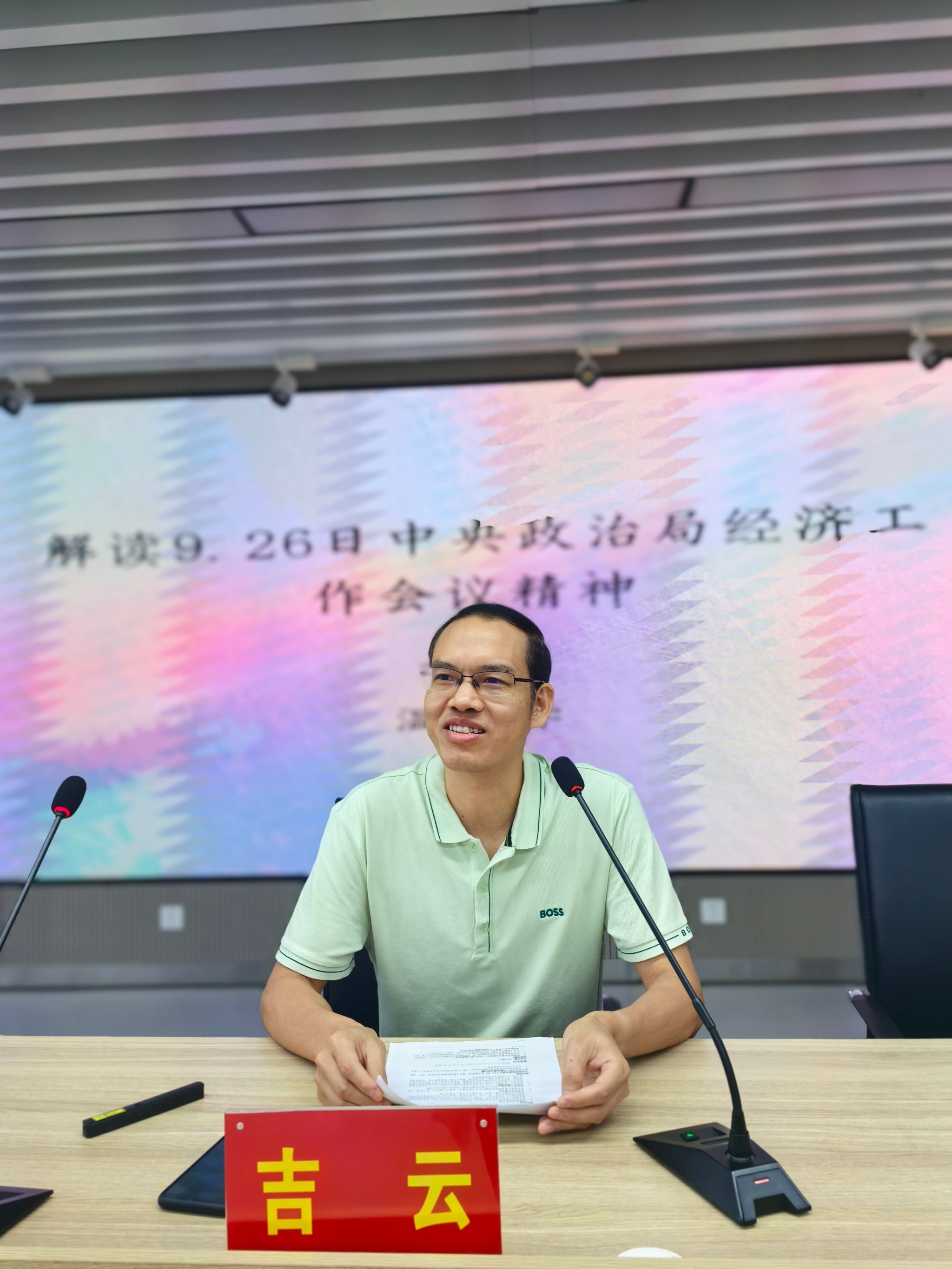 会议伊始,吉云老师进行党的二十届三中全会精神宣讲,他深入浅出地解读了9月26日召开的中央政治局经济工作会议精神,梳理了党的一系列政策措施背后的基本思路与理论逻辑。吉云老师指出此次中央政治局经济工作会议的基本逻辑为:着眼长远、应对当下。首先,吉云老师从国际形势与国内形势两方面指出本次国家会议的宏观背景。纵观国际,当前国际环境动荡,贸易环境不断恶化,中国面临的威胁与机会并存,前段时间的美联储降息成为此次会议召开的契机。眼观国内,近几年我国经济出现通缩的危险信号,中国亟需通过各种措施缓解当前经济压力。之后,吉云老师不仅从经济高质量增长与可持续发展两方面解析财政货币政策逆周期调节、发挥股权投资带动作用与降准降息三项长远政策,也从如何缓解房地产与地方债压力,如何拉动就业保障民生等问题出发,解析了土地、国债与基层“三保”等措施。