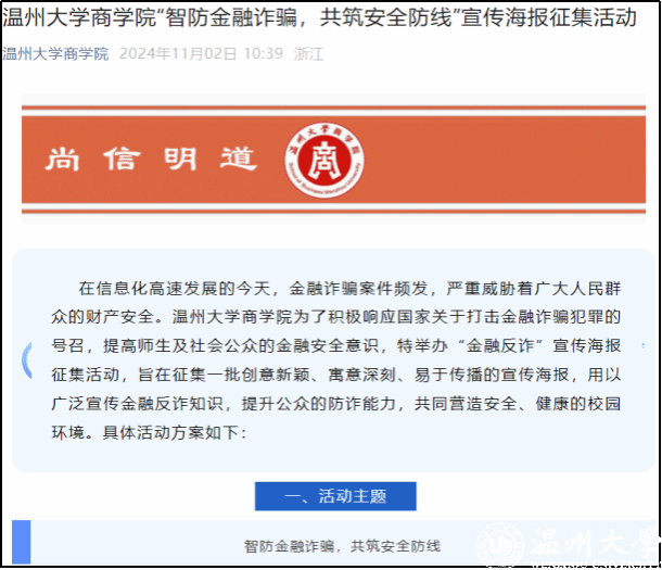 于2024年10月至11月期间,全面开展第十届“平安温大宣传月”活动,致力于全面营造“争创5A等级平安校园”的浓厚氛围,切实维护校园安全稳定。