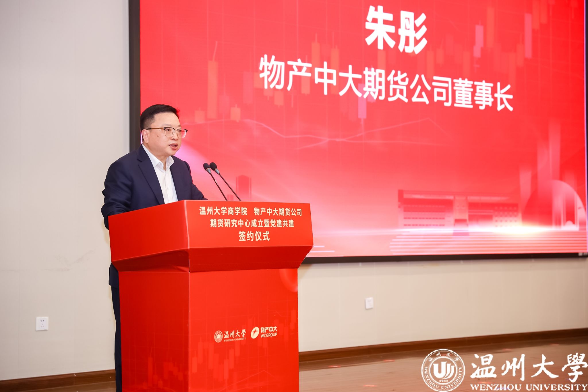仪式上,温州大学副校长王军代表温州大学致辞。他表示,与物产中大期货公司携手共建期货研究中心,是深化产科教融合、深化金融服务实体经济的重要举措。期货研究中心的成立,不仅是校企资源整合的典范,更是服务国家“双碳”战略、助力区域经济高质量发展的创新实践。此次合作,温州大学将以“优势互补、资源共享”为原则,聚焦原材料期货、碳中和金融等前沿领域,打造产学研一体化的“温州样板”,为民营企业注入金融活水,为政府决策提供智库支持。未来,我们还将联合培养金融专业硕士人才,打造“期货+产业”的产学研高地,为温州建设区域性金融中心注入新动能。