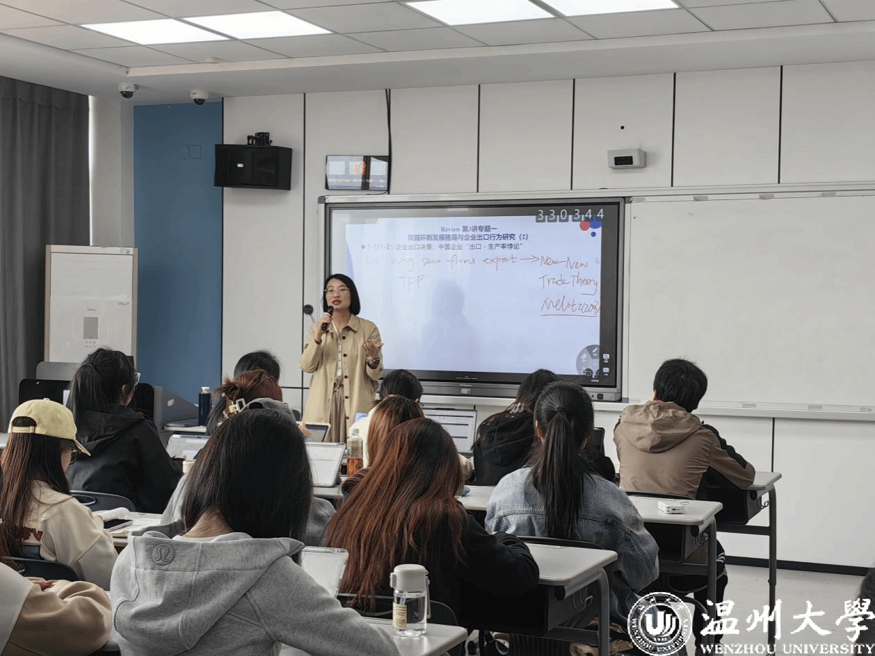 课程伊始,陈老师以“中国企业出口-生产率悖论”为切入点,引导学生系统回顾前几周所研读的关于企业出口决策以及出口与企业生产率关系的国内外文献,并提出该话题最新的研究进展,引起学生进一步阅读的兴趣。课堂上,陈老师强调:“学术研究需以文献为基、严谨求证,文献阅读是发现研究空白的第一步。”