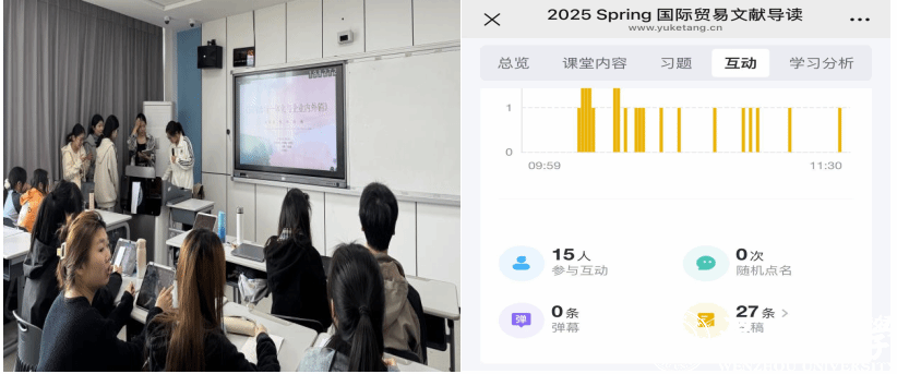 课程创新采用“雨课堂投稿+动态研讨”模式,学生课前根据上节课发布的任务进行相关文献搜索及阅读,课堂上通过雨课堂平台提交基于文献检索的选题方向与研究思路。陈老师从中筛选出具有启发性的投稿,围绕“学术论文选题的创新性与可行性”展开深度互动。
