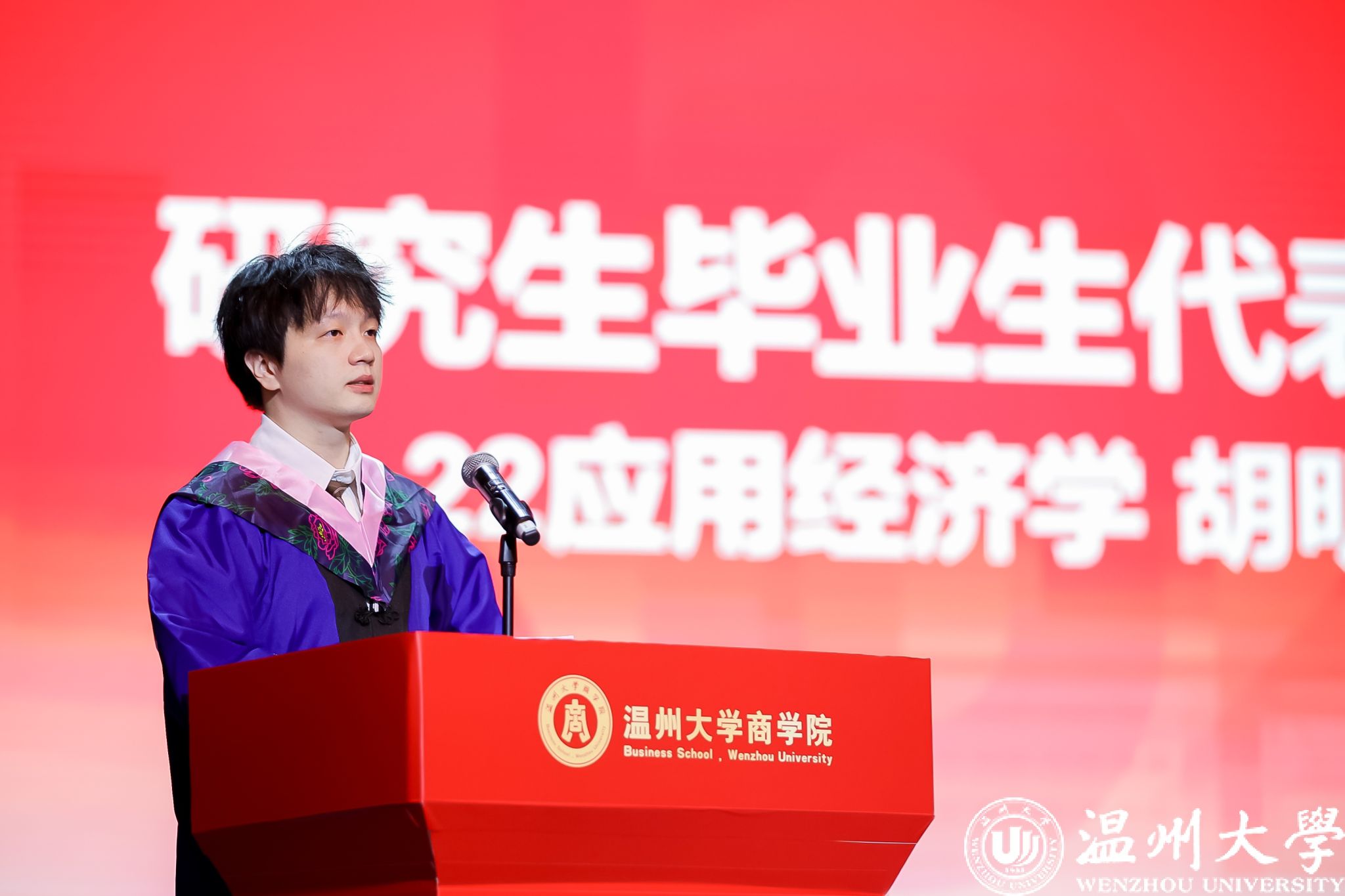研究生毕业生代表22应用经济学胡明骏在发言中表达了对母校、导师、同窗及家人的感激之情。他回顾了三年的学术探索与成长,特别感谢导师罗建利教授的悉心指导,赞美了同窗情谊的珍贵。胡明骏表示,未来将把所学化为社会进步的涓滴之力,不负母校培养。从老师到同学,再到家人,胡同学感恩三年研究生生涯中遇到的一切,他也相信在未来能成为让母校骄傲的学术精英。