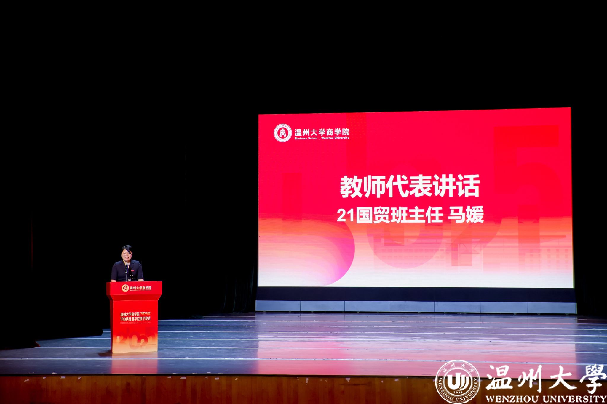 教师代表马媛老师在发言中回顾了与学生共度的点滴时光,勉励大家坚守“尚信明道、勇毅笃行”的品格,在未来的岗位上勇于担当,展现商院学子的风采。“竹杖芒鞋轻胜马,谁怕,一蓑烟雨任平生”,马媛老师告诫大家在未来的生活中要有豁达乐观的心态,在反思中成长,在沉淀中重生,跨越山海,遇见更加美好的自己。