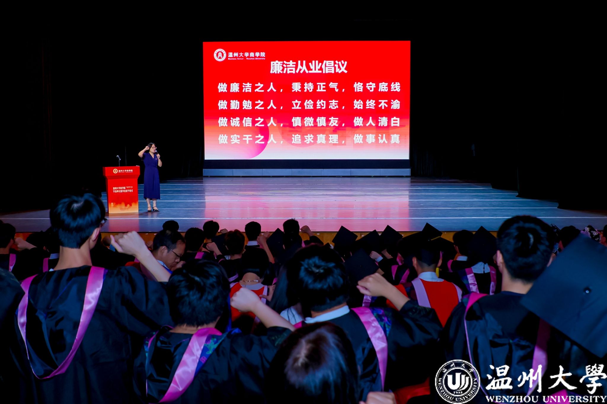 作为温州市清廉金融共建基地,我院始终注重培养学生的道德品质。党委副书记、纪委书记曾蓓蕾向全体毕业生发起廉洁从业倡议,带领全体毕业生庄严宣誓,承诺坚守清廉底线,以高尚品格和职业操守为社会贡献力量。
