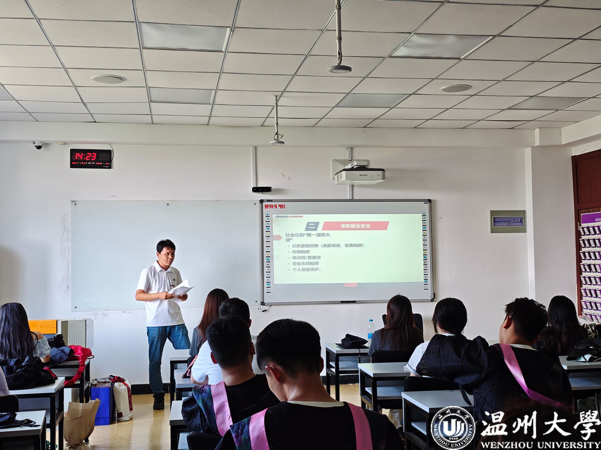 班会系统部署了毕业生离校及步入社会关键阶段的安全教育工作。内容涵盖离校前的宿舍检查、物品保管、旅途与聚会安全提醒;求职就业过程中需警惕的虚假招聘、传销陷阱、网贷诈骗、租房风险及网络信息安全;班会特别强调了意识形态安全风险,要求毕业生增强政治敏锐性,坚决防范非法传教和宗教非法活动,维护网络安全,做社会主义核心价值观的践行者与守护者;各班主任同时引导毕业生关注心理健康,积极应对身份转变带来的挑战。
