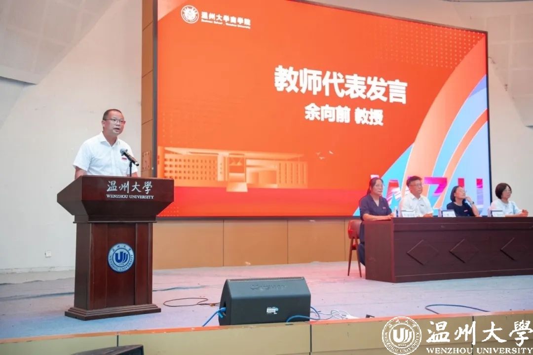 教师代表余向前教授用轻松幽默而又发人深省的语言,为新生送上四重寄语。第一,他强调主动学习的重要性。在信息爆炸的时代,不缺知识,缺少的是主动学习的能力,希望同学们打破“被动接受”的思维定式,主动规划大学生活。第二,他提醒新同学大学不是“终点站”,而是“加油站”。在“万物皆可卷”的时代,他希望同学们能保持“Stay hungry, Stay foolish”的进取心态。第三,他指出在成长的路上不要忘了家人这一坚强后盾。第四,他呼吁同学们广泛涉猎、勇于尝试,在做自己人生的“CEO”中实现真正的成长。