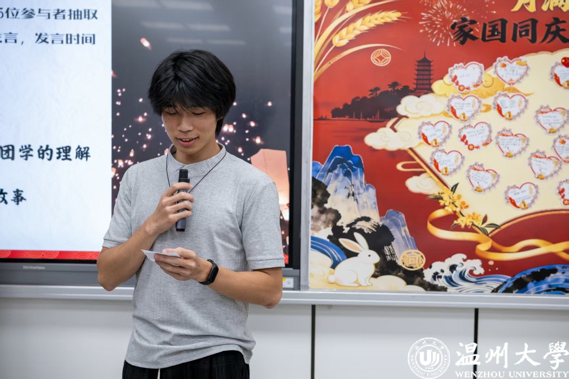 压轴登场的是“家国盲盒”环节。主持人随机报出号码,15 位幸运成员依次抽取话题盲盒,围绕 “九三阅兵观后感”“对团学工作的建议”“中秋主题故事分享” 等话题展开 1 分钟即兴发言。“九三阅兵时,看到威武的军队、先进的装备,我真切感受到祖国的强大,也更加坚定了努力学习、报效祖国的决心”“希望团学未来能多开展跨部门合作活动,让大家有更多交流机会”…… 真挚的话语、独到的见解赢得阵阵掌声,每位发言者还从奖品盲盒中抽取了月饼礼盒等惊喜礼品。