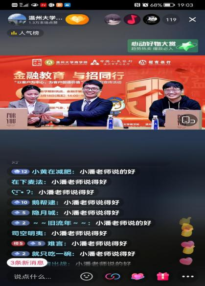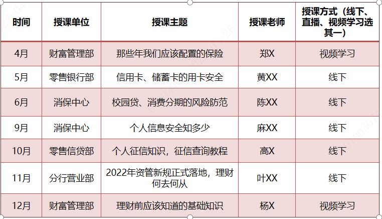 开展月度金融讲堂。通过广泛征集系统内金融教育课件,制定《招商银行温州分行月度金融讲堂授课表》,明确全年授课主题、授课老师及授课方式。授课主题包括理财、基金、黄金、保险、外汇、个人贷款、银行卡(信用卡)使用、防范电信诈骗等内容,授课方式包括班级(金融宣讲团)现场授课、网络直播、视频学习等方式。