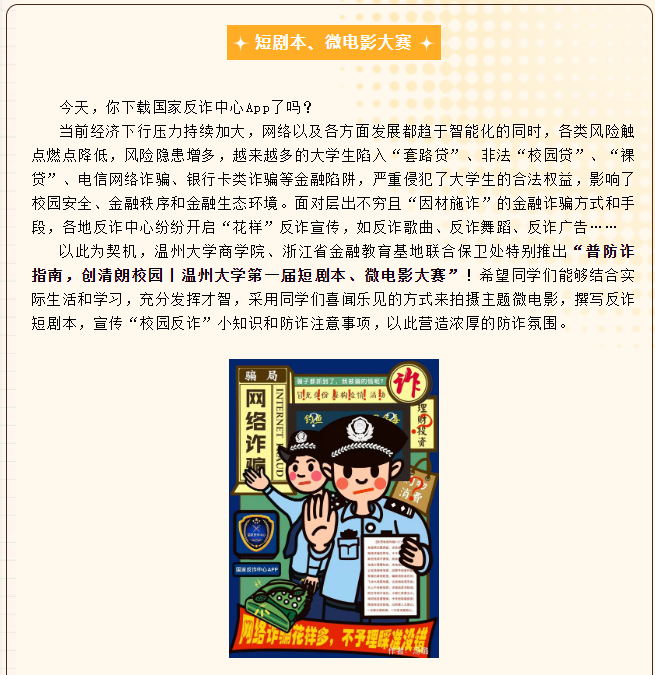为了让更多学生了解金融知识,防范金融诈骗,金融宣传教育基地联合温州大学保卫处特别推出“普防诈指南,创清朗校园|温州大学第一届短剧本、微电影大赛”,通过短剧本、微电影的制作,营造浓厚的防诈氛围,让更多的学生能更深刻理解防范电信诈骗的重要性。截至4月22日,共收到来自5个银河赌场