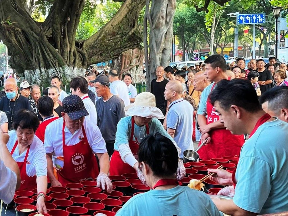 清晨,阳光缓缓洒下,红日亭的电子屏滚动播放着生日祝福语、捐款金额,耳旁响起生日快乐歌,义工们系上围裙,拿起汤勺、筷子,在红日亭里忙活起来,他们忙碌的脚步声,唤醒着城市的大爱。