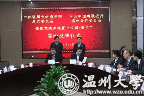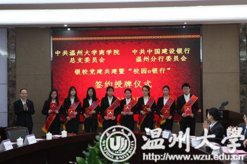 举行银校共建暨“校园e银行”签约授牌仪式。温州大学校长赵敏、建设银行浙江省分行副行长陈根海出席仪式并分别致辞。建设银行浙江省分行、温州分行和温州大学有关负责人及师生代表参加了签约授牌仪式。根据签约协议,共建双方将党建工作建立在银校合作项目上,创建国有银行、瓯越名校党建共建品牌。