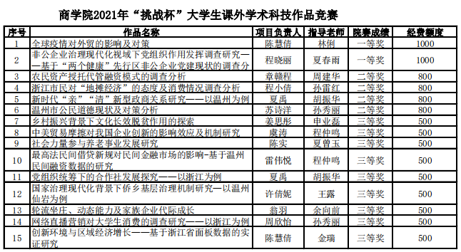 将予以各组(院一等奖1000元,二等奖800元,三等奖500元)项目孵化经费作为奖励。具体项目获奖名单如下:
