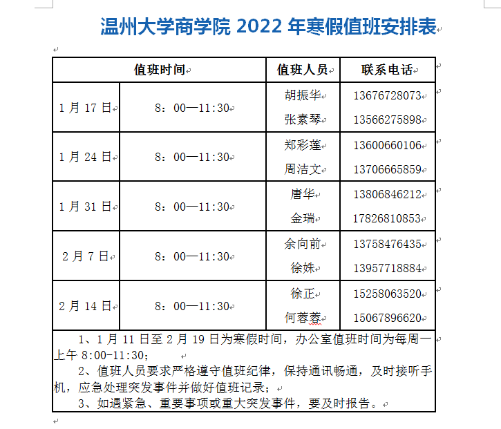 银河赌场-澳门银河赌场官网 2022年寒假值班安排表