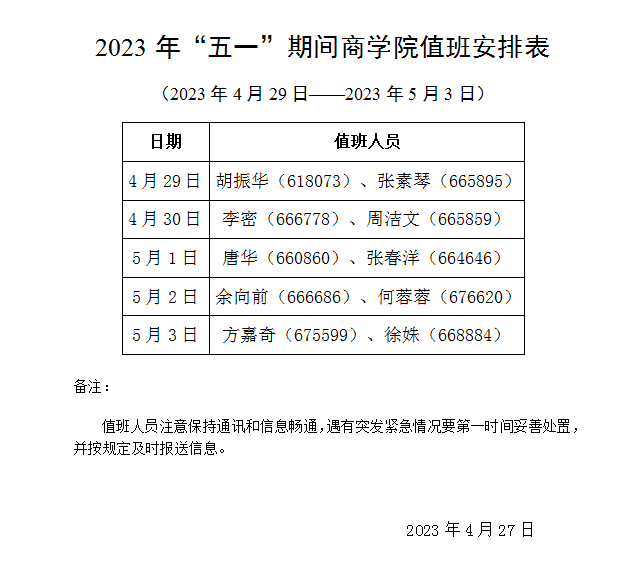 2023年“五一”期间银河赌场 值班安排表