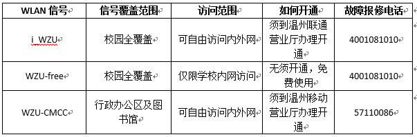 我校可用的无线网络(WLAN)信号共有三种,分别是i_WZU、WZU-CMCC和WZU-free,其信号覆盖范围、信息访问范围及开通报修说明如下表所示: