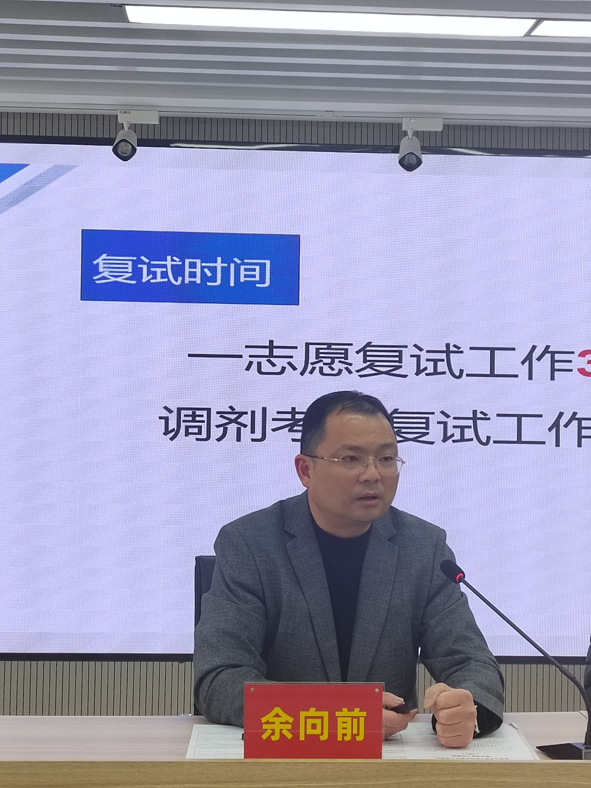 会上,余向前副院长通报了本届研究生复试将实行线上考核的重要信息,详细阐述了复试流程以及申请调剂的注意事项。他特别强调了“两识别”、“四比对”、“三随机”的原则,以确保复试的公平公正。此外,余院长还明确了复试内容及其分值比例,强调了对专业知识的考核,同时注重考察学生的综合素质和外语能力。