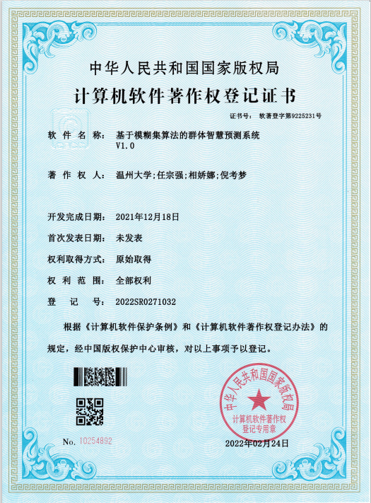 温州人经济研究中心研究员任宗强博士与硕士生相娇娜等合作完成的《基于模糊集算法的群体智慧预测系统》通过最终审查并获得由中华人民共和国版权局颁发的计算机软件著作权登记证书。
