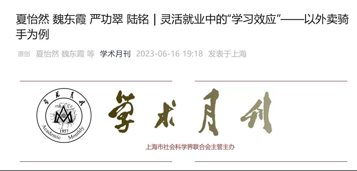 魏东霞教授、上海交通大学严功翠老师、上海交通大学陆铭教授合作在人文社会科学北大核心、CSSCI、AIM权威和社科基金资助期刊《学术月刊》上发表题为《灵活就业中的“学习效应”—以外卖骑手为例》的论文。