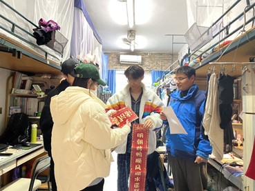 学生党员们纷纷手持印有“新年快乐”、“诸试顺利”、“福”等标语的卷轴,分组进入新生宿舍,向同学们表达问候和祝福。同学们面对学生党员热情洋溢的祝福,个个眉开眼笑,纷纷鼓掌表示感谢。寝室内充满着欢声笑语,到处洋溢着欢乐的新年氛围。