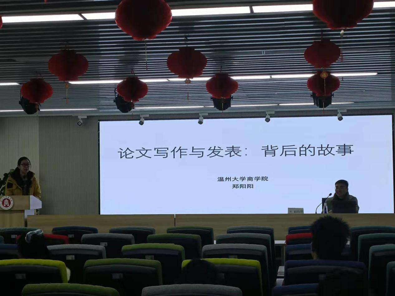 A226为21级全体研究生作《论文写作与发表背后的故事》讲座。郑阳阳作为主讲人,向学生们分享了自己的学术经历和心得体会,并就论文写作与发表提出相关建议。他指出论文是文学和美学的结合,基础稍差的同学可以通过学习提高文学素养,论文的格式和排版要规范美观。“骐骥一跃,不能十步;驽马十驾,功在不舍”,写论文不能一蹴而就,需要不断修改完善。