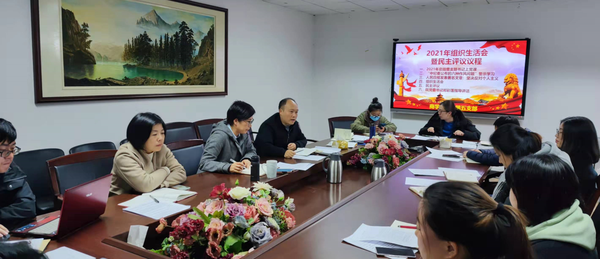 会议分重温入党誓词、2021年总结暨支部书记上党课、“中纪委公布的六种作风问题”警示学习、学习“人民日报发表署名文章:坚决反对个人主”、组织生活会、民主评议、院领导指示讲话6个环节。会议紧紧围绕深入学习贯彻习近平新时代中国特色社会主义思想和党的十九届六中全会精神,坚定维护习近平同志党中央的核心、全党的核心地位,维护习近平新时代中国特色社会主义思想的指导地位,牢固树立“四个意识”,坚定“四个自信”,更好地发挥基层党组织战斗堡垒作用和党员先锋模范作用进行。按照“照镜子、正衣冠、洗洗澡、治治病”、支部品牌“三全三育”精神和“服务一以贯之,不断突破赋能” 的理念。