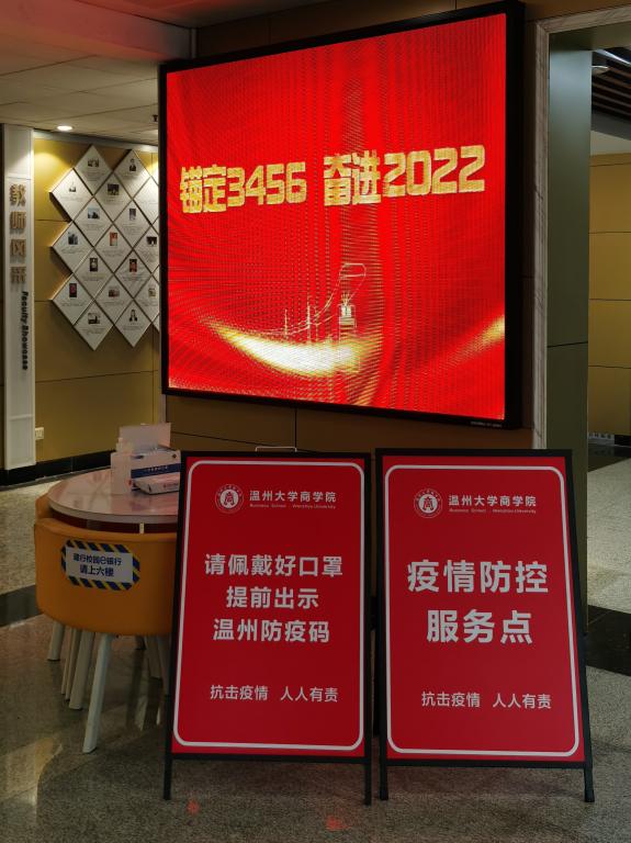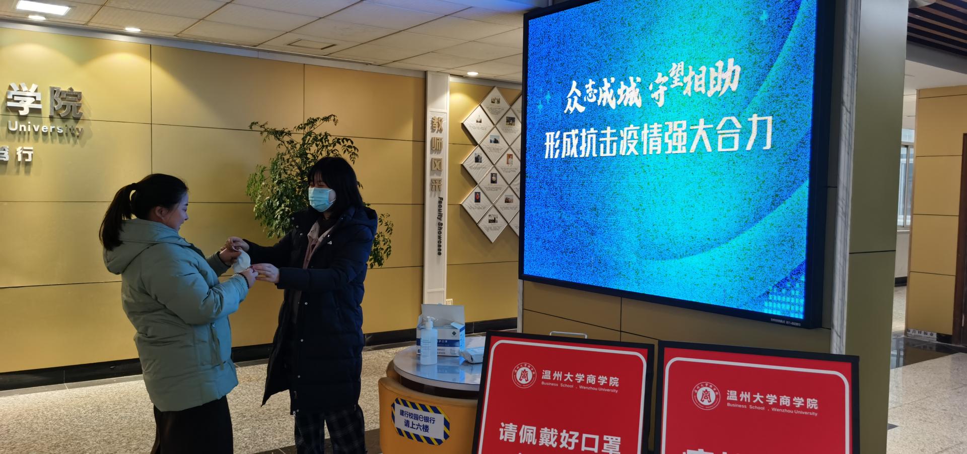 二楼大厅,“党员服务岗”设立在醒目位置,党员志愿者身着红马甲,对出入师生测量体温,提醒佩戴口罩,并无偿提供口罩、消毒洗手液等防疫物资,用实际行动体现商院温度。