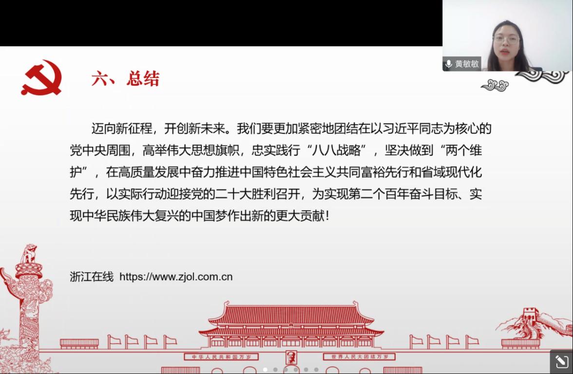 会上,研究生第二党支部宣传委员黄敏敏同志首先带领大家学习、解读了浙江省第十五次党代会报告。报告用“9个这五年”分领域全方位呈现了过去五年浙江的历史性成就、系统性变革;用“4个更加深刻”和“2个根本在于”阐释了五年感恩奋进的至深体会;通过凝练“8个方面规律性认识”,明确了要把握“两个先行”奋斗目标和“8个高地”具体目标;坚决拥护“两个确立”、坚决做到“两个维护”,系统深入学习领会习近平新时代中国特色社会主义思想和习近平总书记关于浙江工作的重要指示批示精神,是新征程上奋力推进共同富裕先行和省域现代化先行的行动纲领。