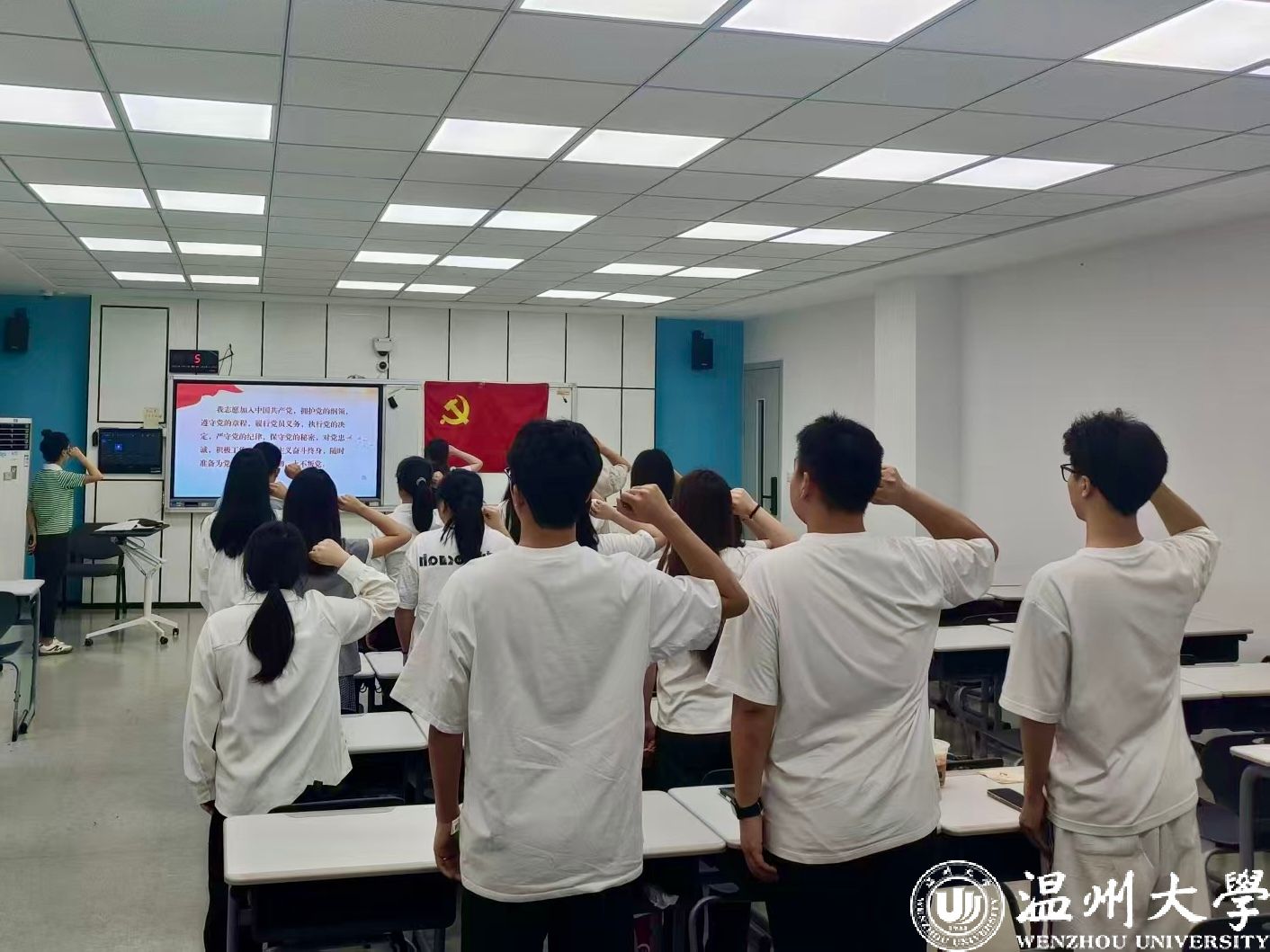紧接着,重温入党誓词。在刘颖同志的带领下,全体毕业生党员右手握拳,面对党旗许下庄严承诺。神圣的誓言再次回荡在耳畔,成为大家的指引与动力,提醒着他们无论身处何方,都要牢记入党时的初心和使命,以实际行动践行对党的忠诚。
