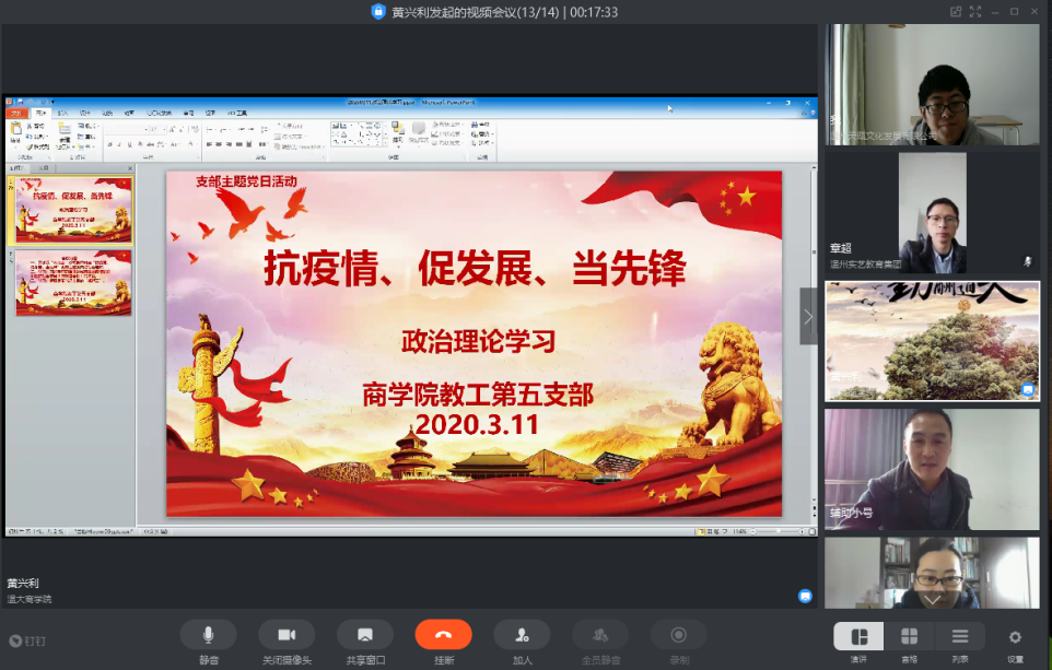 本次视频会议形式学习也是本支部第一次尝试的形式,提前一天在钉钉群里设置日程,会议开始前15分钟自动提醒,学习内容为习近平在统筹推进新冠肺炎疫情防控和经济社会发展工作部署会议上的讲话和瓯海区景山街道党工委书记叶展的理论文章:尽职尽责当好人民的“挑担工”。