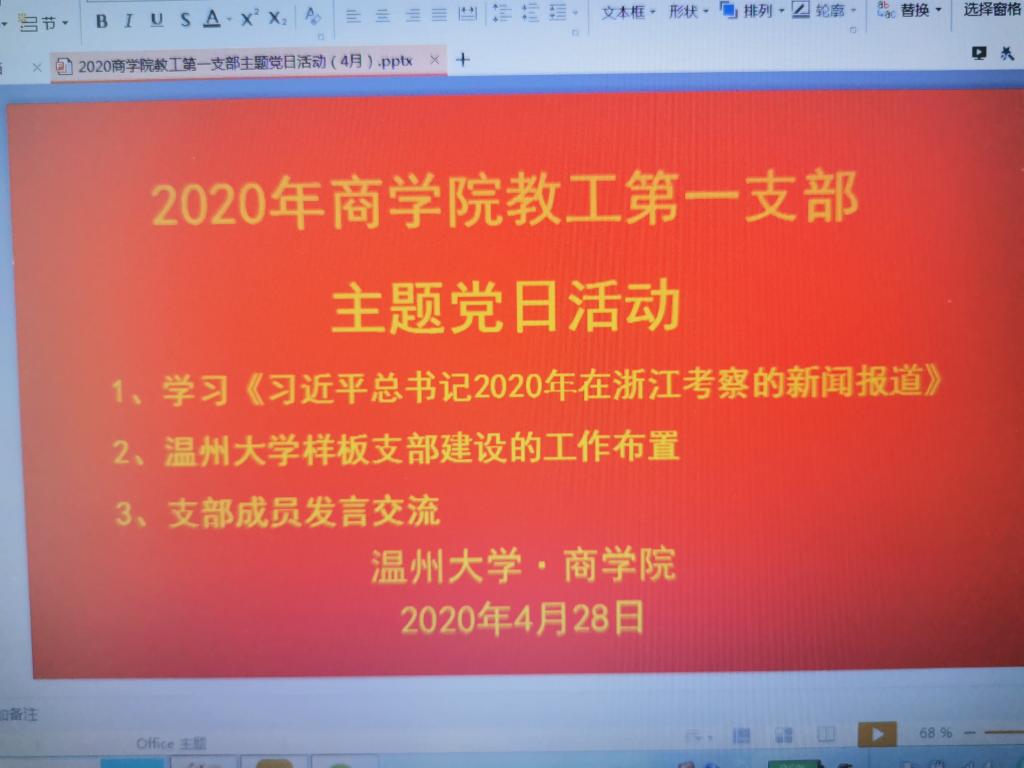 首先,支部书记周建华带领大家观看中央电视台对习近平总书记在浙江考察的新闻报道,学习领会习近平总书记在宁波、湖州安吉和杭州的考察活动的重要讲话精神,了解浙江在抗击疫情、复工复产、“两山理论”、社会治理和数字经济等方面的表现及作用,理解浙江成为新时代全面展示中国特色社会主义制度优越性的重要窗口的责任感和使命感;其次,周老师组织党员教师学习浙江省委书记车俊同志在《新华网》发表的文章《坚决扛起建设“重要窗口”的政治责任》;然后,支部各党员同志分别用“努力、新时代、全面、制度优越性、重要窗口”等五个关键词谈了学习体会。最后,支部书记周建华对温州大学样本支部建设的具体工作做了部署和要求,希望大家从支部品牌入手,服务专业建设,服务地方发展,贡献自己的力量和责任担当。