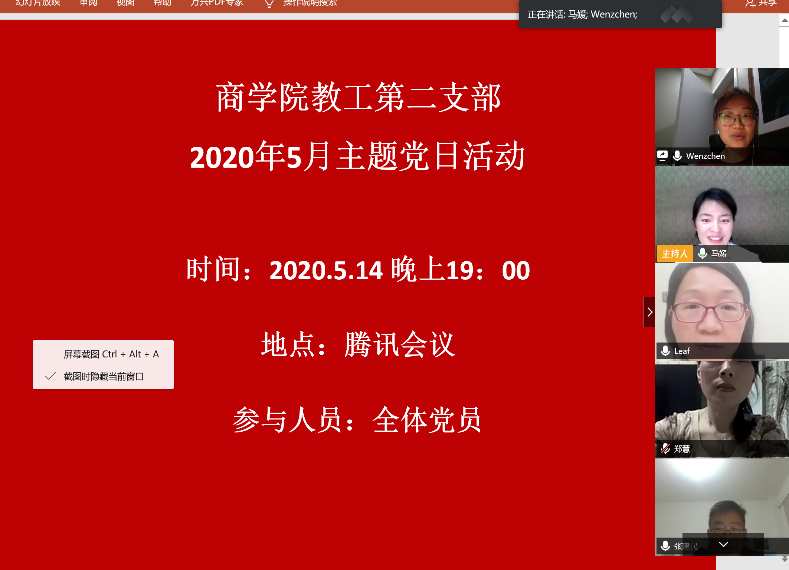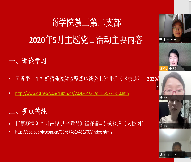 教工第二支部利用腾讯会议开展了线上主题党日活动。支部8名党员参加会议,国贸系非党员老师列席了会议,会议由支部书记陈文芝老师主持。此会主题党日活动分为理论学习和视点关注两个方面。