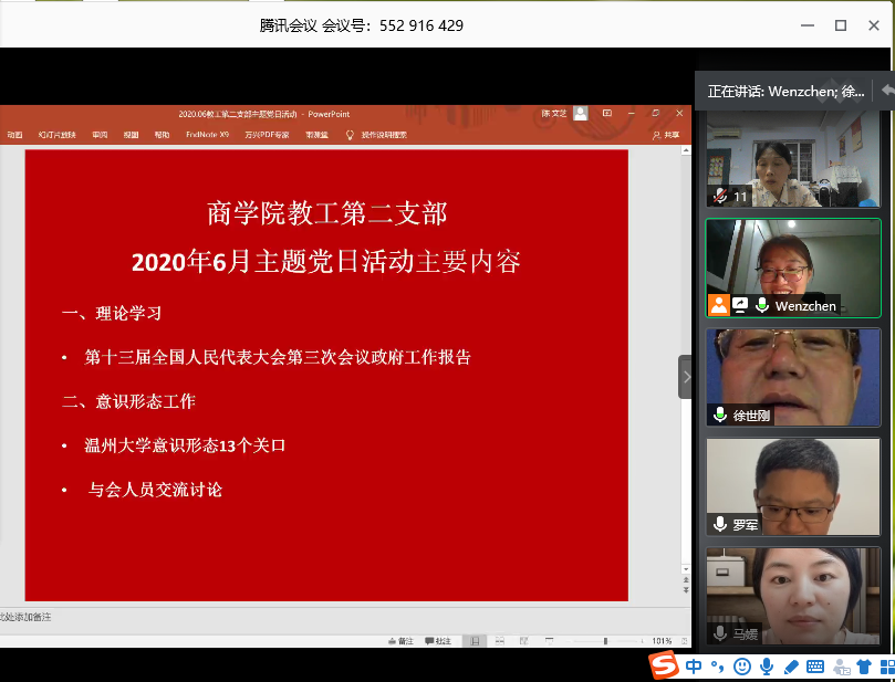 教工第二支部利用腾讯会议开展了线上主题党日活动。支部8名党员参加会议。会议由支部书记陈文芝老师主持。此会主题党日活动分为理论学习和意识形态工作主题讨论两个方面。