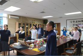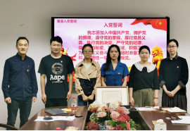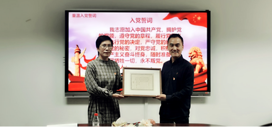 随后黄书记和学工办副主任周洁文同志为四位新入党员佩戴党员徽章,全体党员同志庄重又严肃重温入党誓词,激励广大党员坚定理想信念,不忘初心、牢记使命,增强党组织的凝聚力和战斗力。