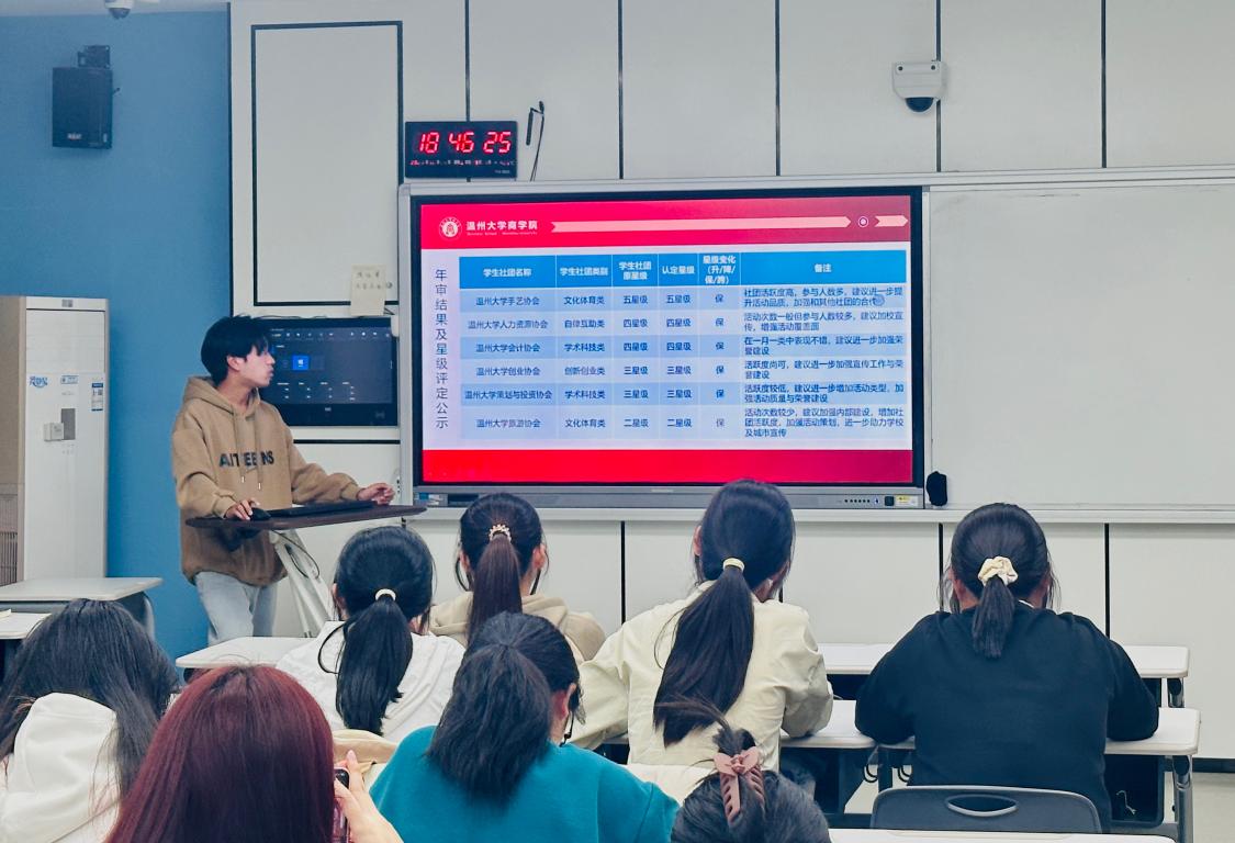 为了鼓励社团举办更多高质量社团活动,社团部部长梁健豪宣布了2022-2023学年各社团的考核结果并对相关社团指出问题、提出建议,为更好的开展社团活动做工作部署。