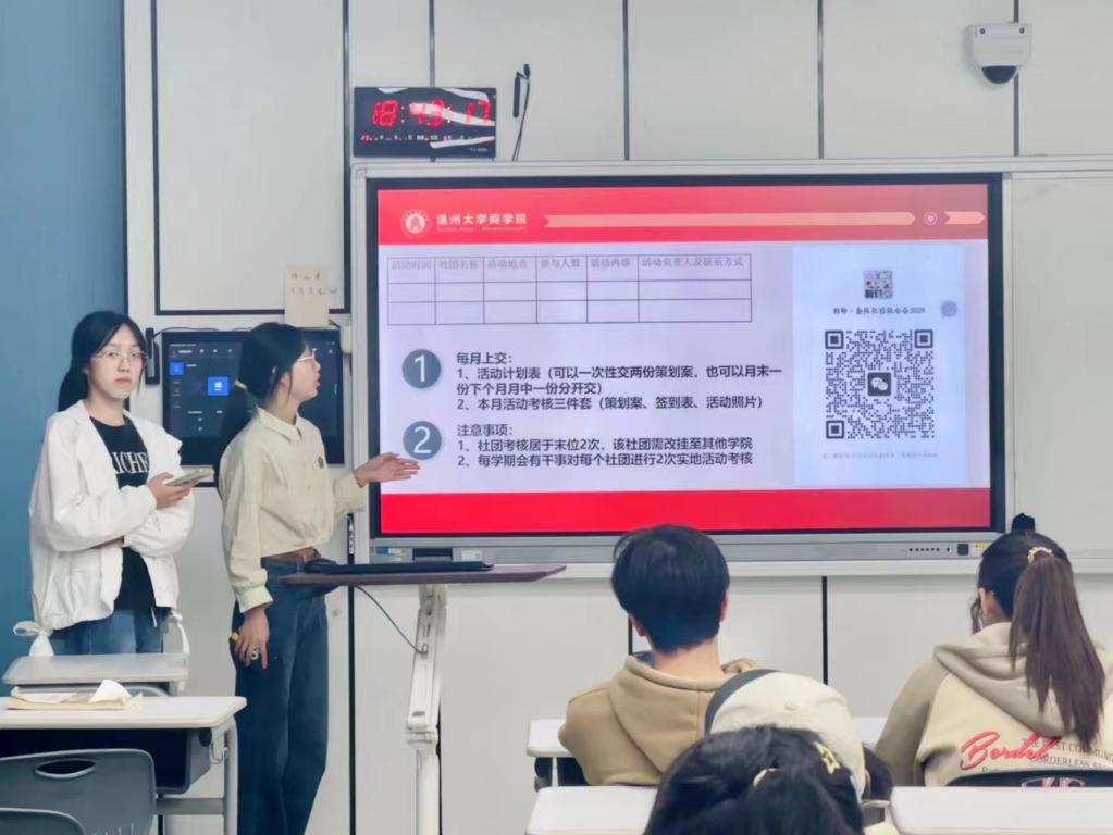 社团部干事李好同学、社团部干事方怡乐同学对社团活动考核以及社团通告的转接进行说明,包括活动考核的常规内容以及线下考核的量化标准。