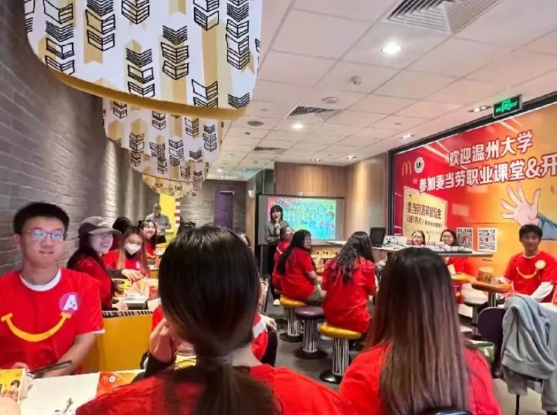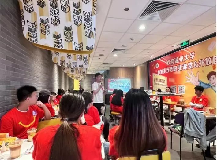 接下来,浙江市场营运经理郑贵从数字化方面向同学们展示了麦当劳发展的无限潜力。郑贵经理通过播放麦当劳南京科技研发中心的相关视频,让同学们更加深入的了解麦当劳线上APP的发展历程。视频也向大家展示了麦当劳始终坚持以为顾客带来更好体验为目标,提升数字化及会员体验,秉持“敢于突破,拥抱变革”的发展理念,不断推动业务数字化与办公数字化的发展。同时,郑贵经理提到麦当劳紧跟时代步伐,拥有强大的自有媒体与私域流量,通过官方网站、微信公众号、小红书等自媒体平台,进一步扩大企业影响力。对于菁英人才项目,郑贵经理向同学们介绍了雇员价值定位理念,并提出“实现自我增值,共创可持续的职业发展空间”,“以灵动的工作方式,悦享多元的职场体验”等目标,使同学们知悉麦当劳对青年人才的期许并且明确了未来发展的目标。