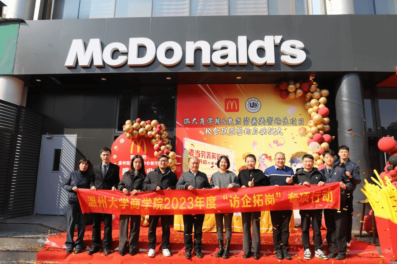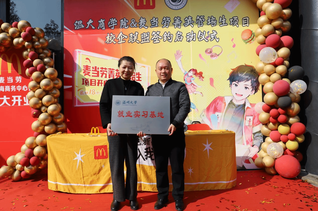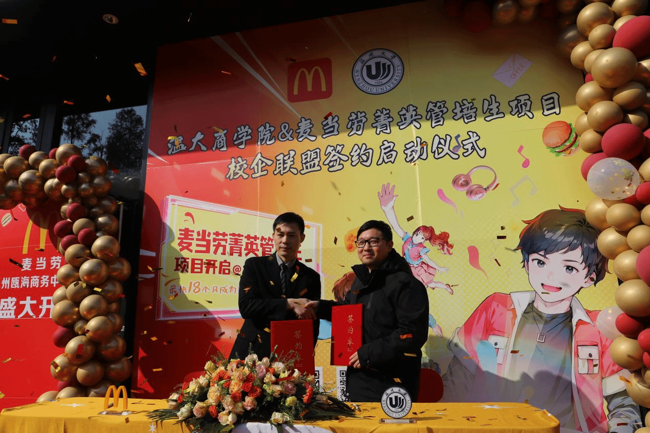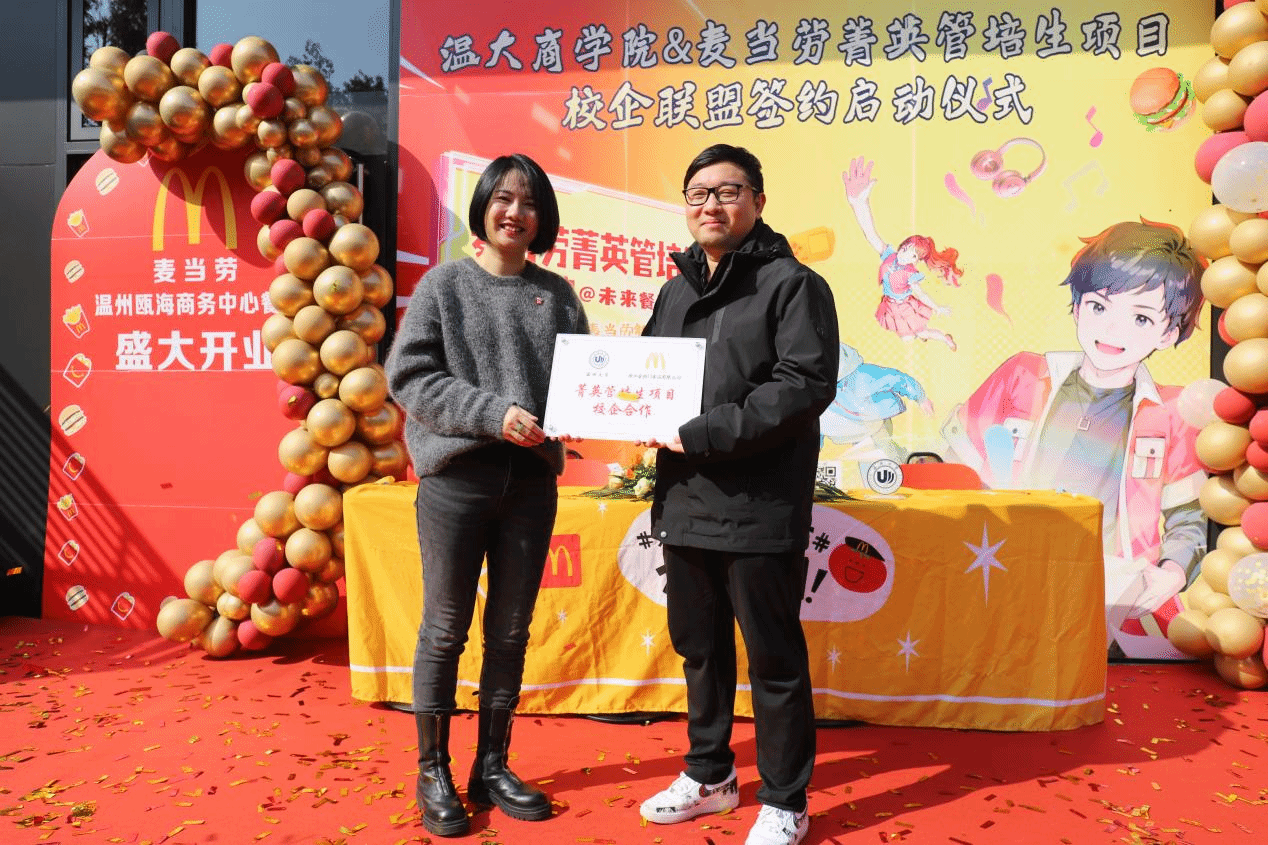 跟岗干部方嘉奇与麦当劳高管共同签署了菁英管培生项目的合作协议,这一项目将为优秀的学生提供实习和培训机会,标志着温州大学浙江麦当劳校企合作迈上新的台阶。