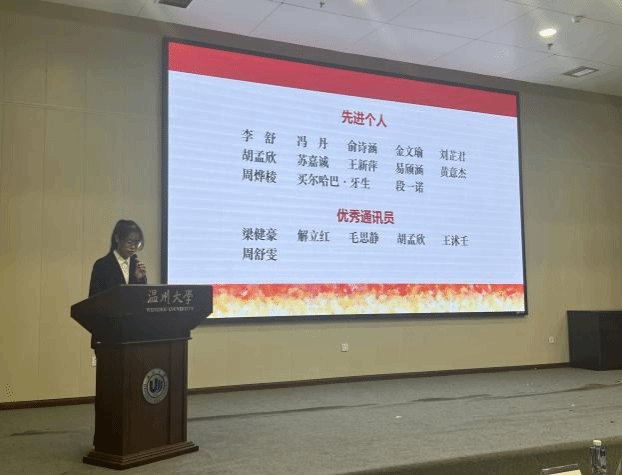 第三个环节表彰环节,由实践部执行部长金文瑜宣读2023年暑期社会实践获奖名单,由唐华书记为优秀实践队颁发证书,并对他们表示了衷心的祝贺。暑期社会实践不仅仅能拓宽学生们的视野,同时能将课堂所学、心中所想通过实践回馈与社会,促进学生们的未来发展。希望同学们能够学习优秀实践队的实践经验,积极参与实践活动。