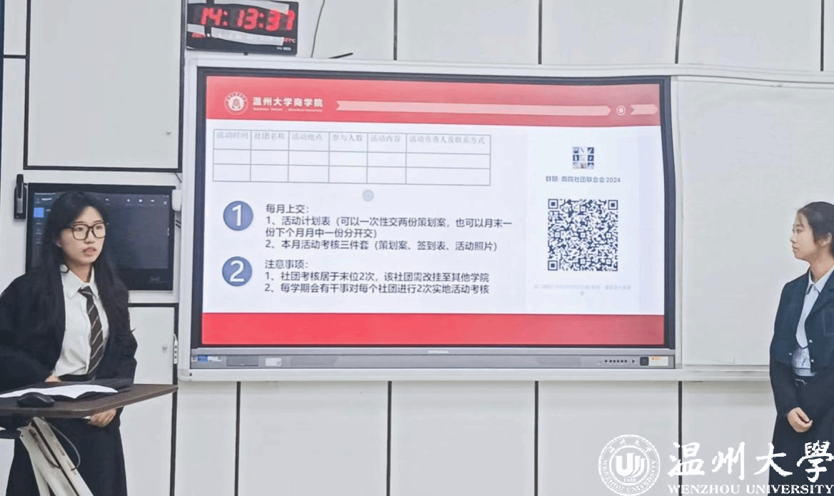 由社团部干事鄢晴和黄子欣同学对社团活动考核相关事宜和社团活动策划案提交等流程进行详细解释,使社团活动策划案等材料的收取规范化,人性化,使各社团负责人更明确每月活动任务。