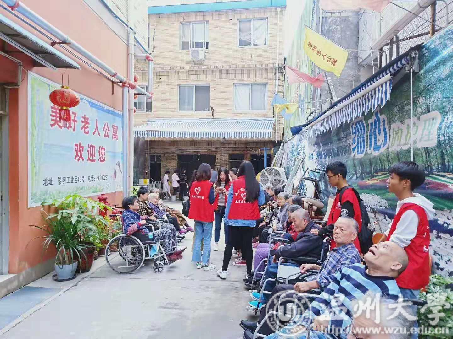 10月21日重阳节后,温大商院蓝经灵志愿者在市区红景天敬老院开展为期六小时的敬老院志愿服务,以志愿活动的方式倡导社会给予老人们更多的关爱。